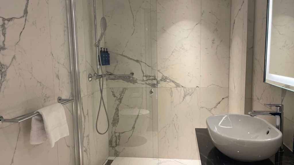 Baderommet var av grei størrelse, men hadde litt lite hylleplass til oppbevaring rundt vasken og for øvrig. Dusjen var romslig og hadde både vanlig dusj og takdusj. Dusjhåndklær var av god størrelse, litt større enn på mange andre hoteller. Såpe og sjampo i dusjen, i tillegg noen toalettartikler og hårføner.