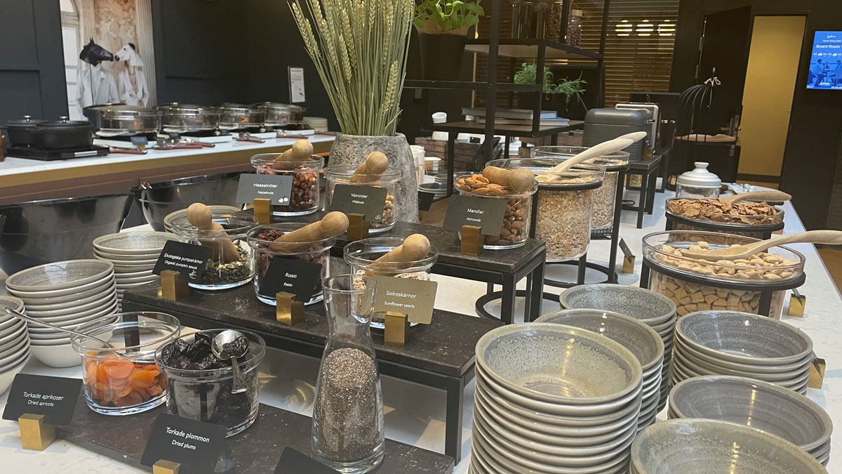 Selve frokostsalen var stor og det var godt om plass mellom bordene. Det fantes flere kaffestasjoner, og servitørene kom med en kanne til bordet hvis man ikke ønsket å bruke kaffeautomaten. Flotte tallerkener og store, gode kaffekopper hever frokostopplevelsen.
