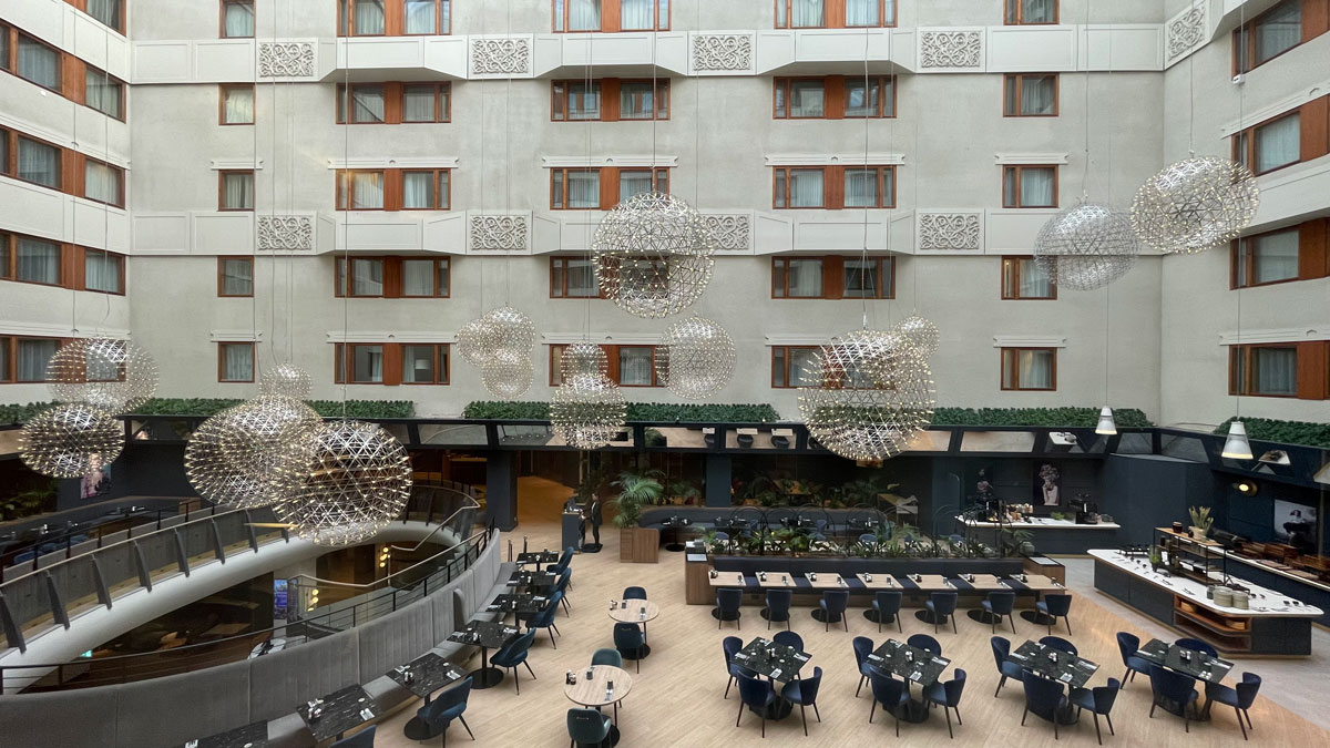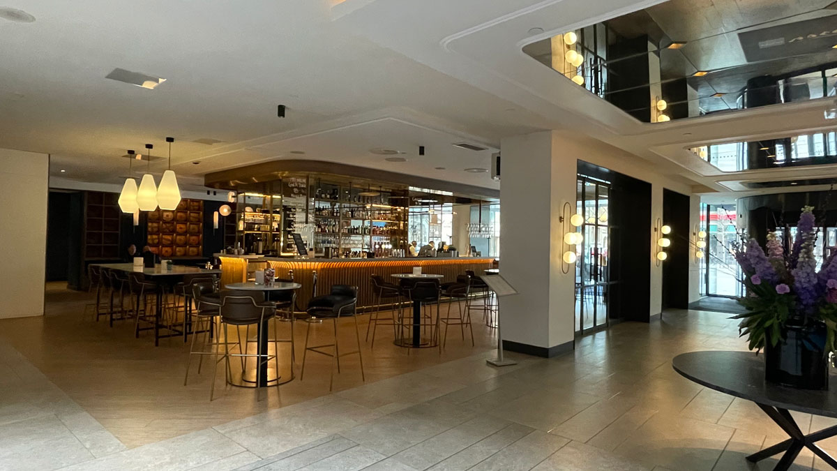 Hotellet er veldig moderne og atmosfæren føltes luksuriøs. Innredningen var stilig og med flotte detaljer og kunst på veggene. Mange sittegrupper og steder der man kunne sitte å jobbe eller ta en kaffe.