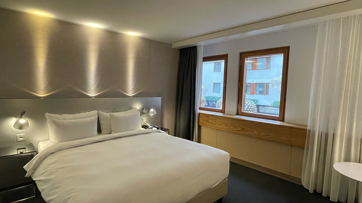 Vi hadde et standardrom på 18 m2. Rommet føltes ganske romslig med god plass rundt sengen, i tillegg var det skrivebord og en lenestol med bord. For et lite tillegg i pris kunne man oppgradere til superiorrom (21 m2).